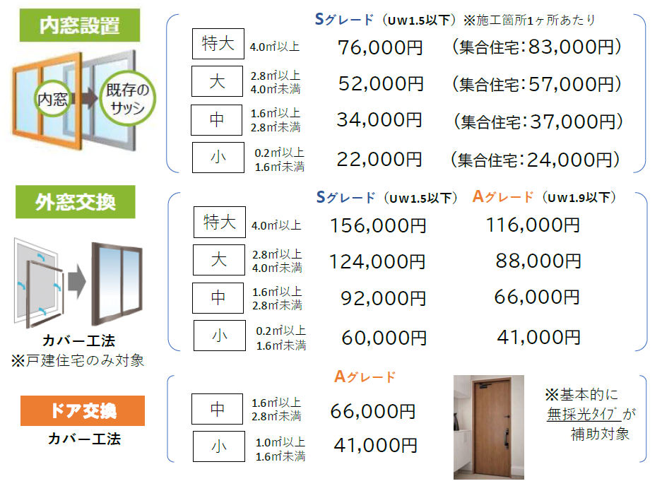既存住宅の窓・ドアを省エネ効果の高い断熱窓・ドアに改修する費用に対して、補助金がもらえる制度です。