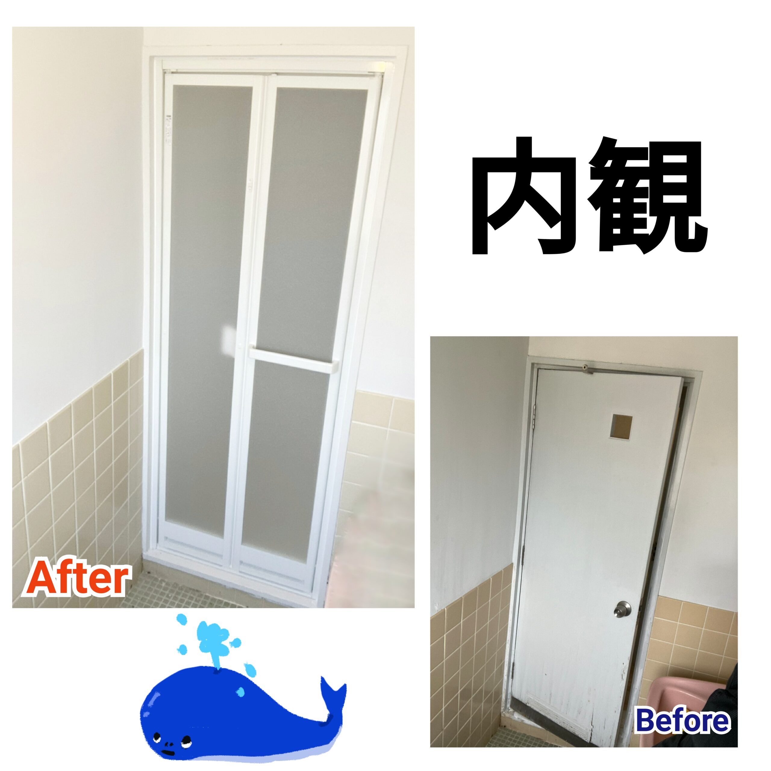 →元々は木製ドアのため水に弱く塗装も剥げて傷んでおりました。新設折戸はカバー工法という既存枠を壊さなず新設枠を被せる施工のため半日で工事は完了です!